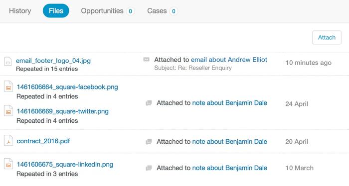Finally we've added some smart grouping to the files tab so from now on any repeating image files will be grouped. This helps to reduce the clutter created by emails stored in Capsule that repeat the same email footer images. Images files are grouped based on file size and name, so you'll still be able to see image files of the same name separately when storing file versions using the same name.
